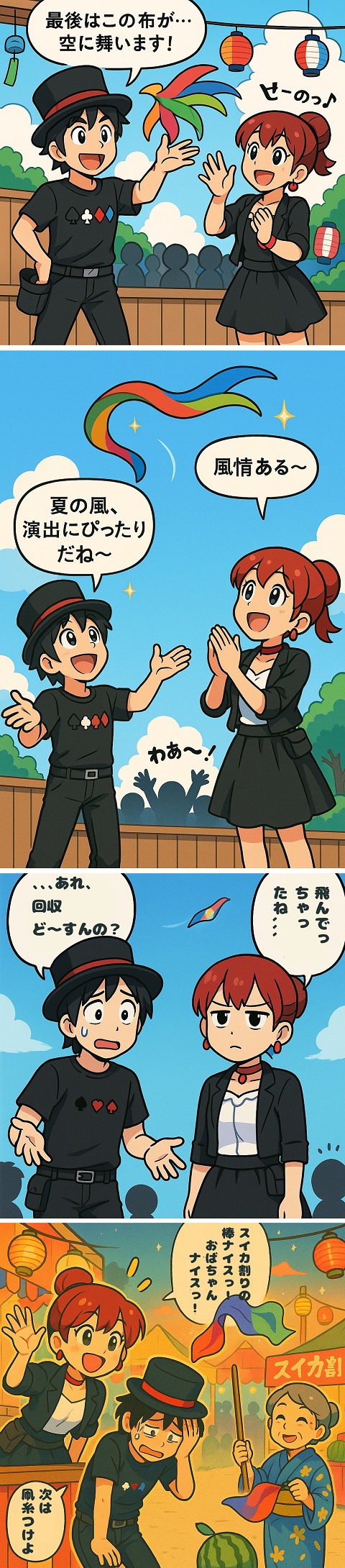 このページでは、m&m咲楽にまつわる四コマまんがを掲載しています。ちょっとした息抜きにご覧頂ければ幸いです。実はこの四コマまんが、ストーリーやセリフ、衣装や背景などを生成AIに指示して作成しています。生成AIが作成したイラストに対して必要に応じて少し手を加えて完成です。不定期に少しずつ増やしていきますのでどうぞお楽しみに♪